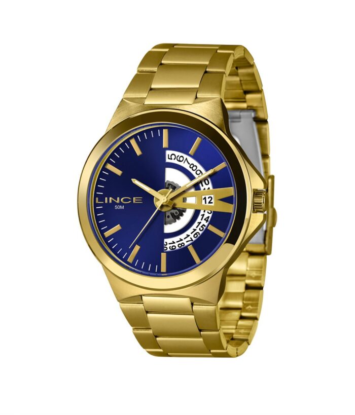 Relógio masculino marca Lince. Caixa em aço, pulseira dourada e fundo azul.