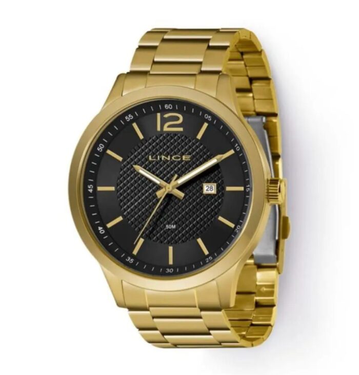Relógio masculino marca Lince. Caixa em aço, pulseira dourada e fundo preto.