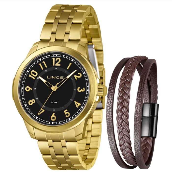 Relógio masculino marca Lince. Caixa em aço, pulseira dourada e fundo preto. Acompanha pulseira de couro de brinde.