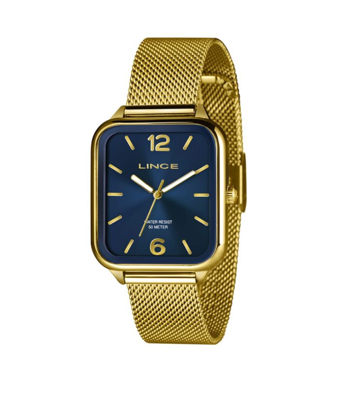 Relógio masculino marca Lince. Caixa em aço, pulseira dourada e fundo azul.