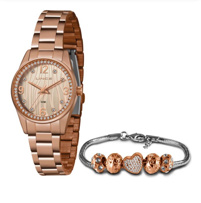 Relógio marca Lince, feminino. Caixa em aço, pulseira rosê, fundo rosê animal print pulseira de brinde. (Brinde pode ir diferente da foto)