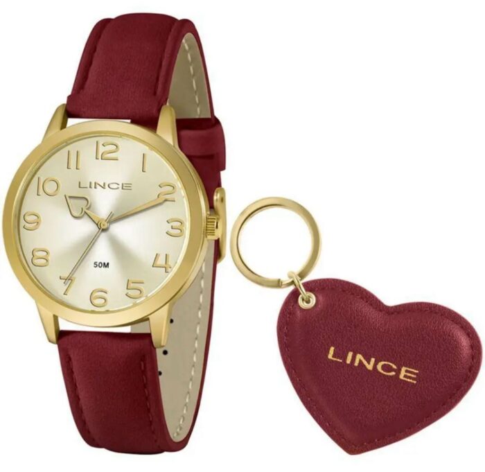 Relógio marca Lince, feminino. Caixa em aço, pulseira em couro marrom e chaveiro coração em couro marrom de brinde
