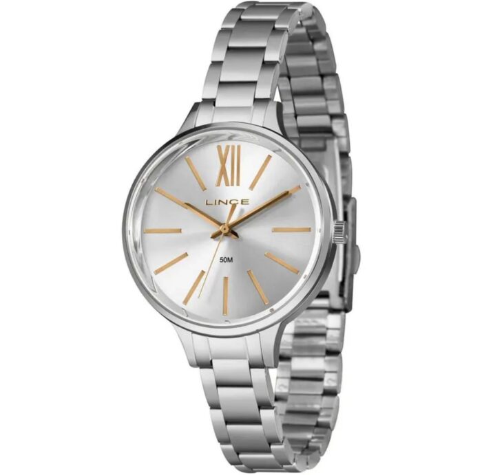 Relógio marca Lince, feminino. Caixa em aço, pulseira prateada e ponteiro dourado