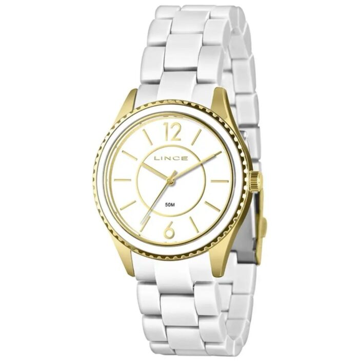 Relógio marca Lince, feminino. Caixa em aço, pulseira branca