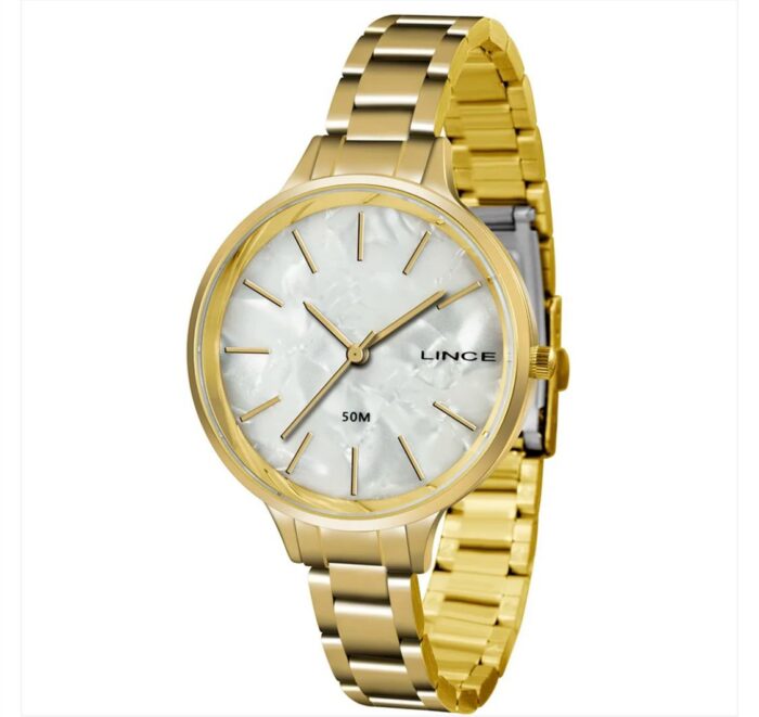 Relógio marca Lince, feminino. Caixa em aço, pulseira dourda e fundo madre pérola