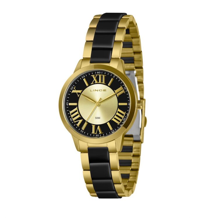 Relógio marca Lince, feminino. Caixa em aço, pulseira preta e dourada