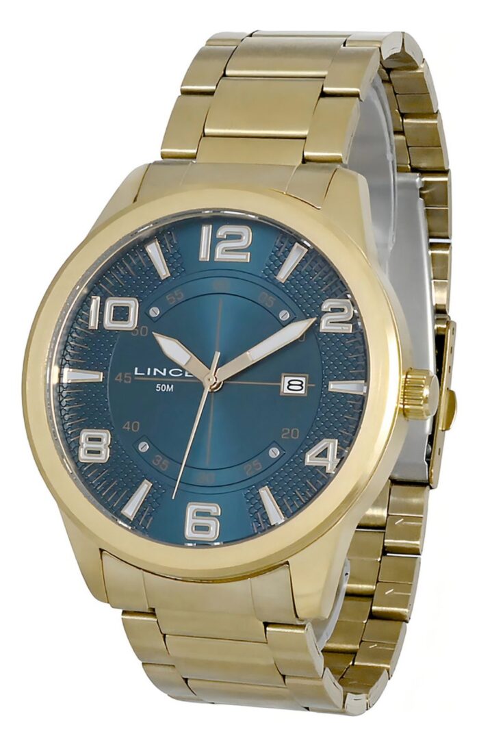 Relógio masculino marca Lince. Caixa em aço, pulseira dourada e fundo azul.