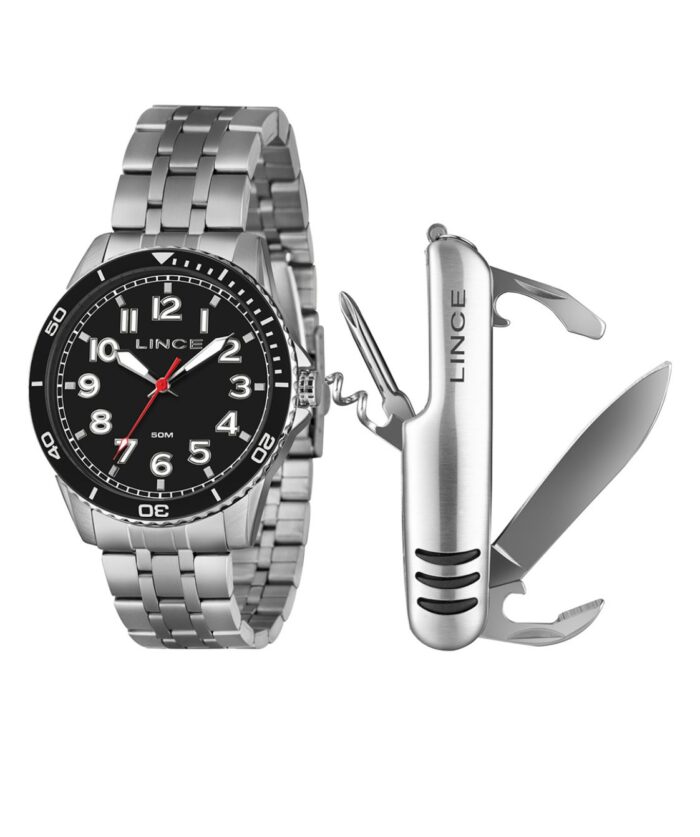 Relógio masculino marca Lince. Caixa em aço, pulseira prateada e fundo preto. Acompanha um canivete de brinde.