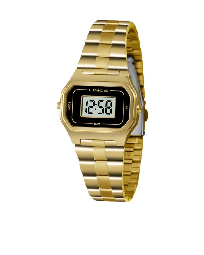 Relógio masculino digital da marca lince. Caixa em aço, pulseira dourada, detalhes em preto