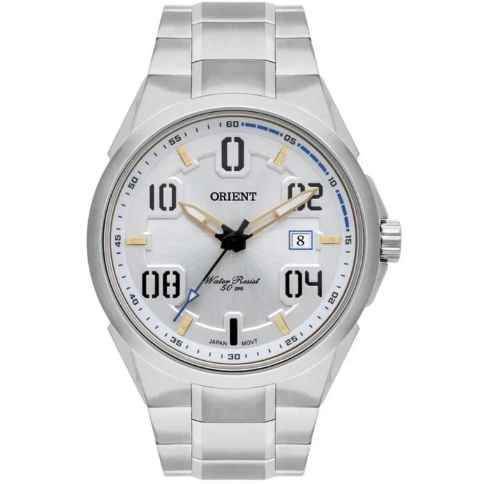 Relógio marca Orient, masculino. Caixa em aço e pulseira prateada.