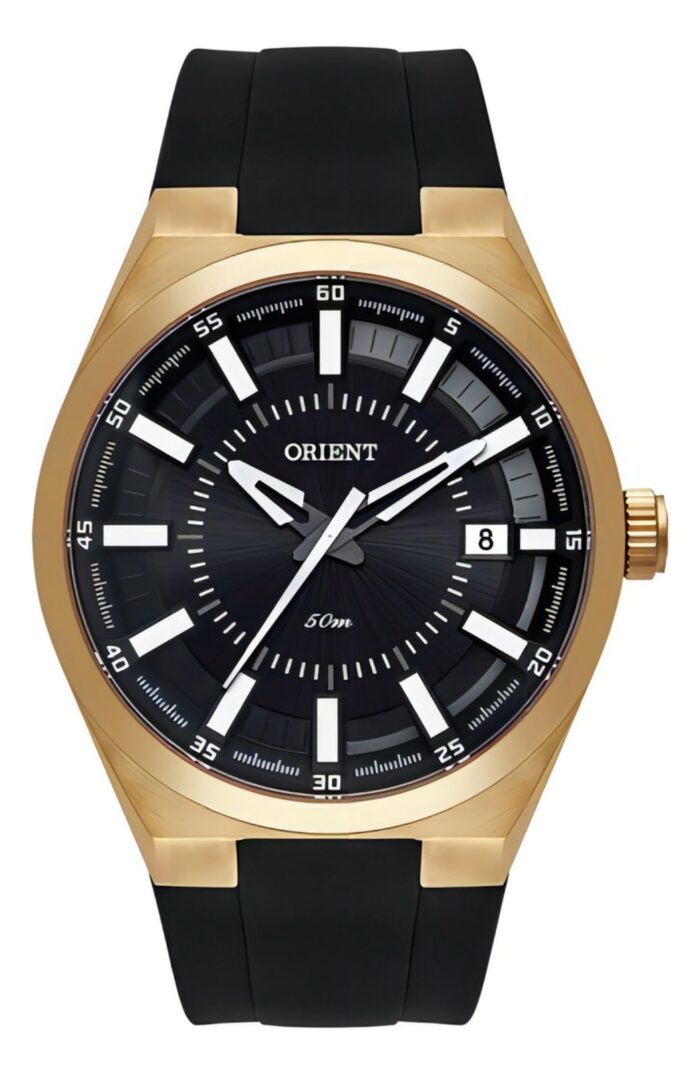 Relógio marca Orient, masculino. Caixa em aço dourada e pulseira em silicone preto.