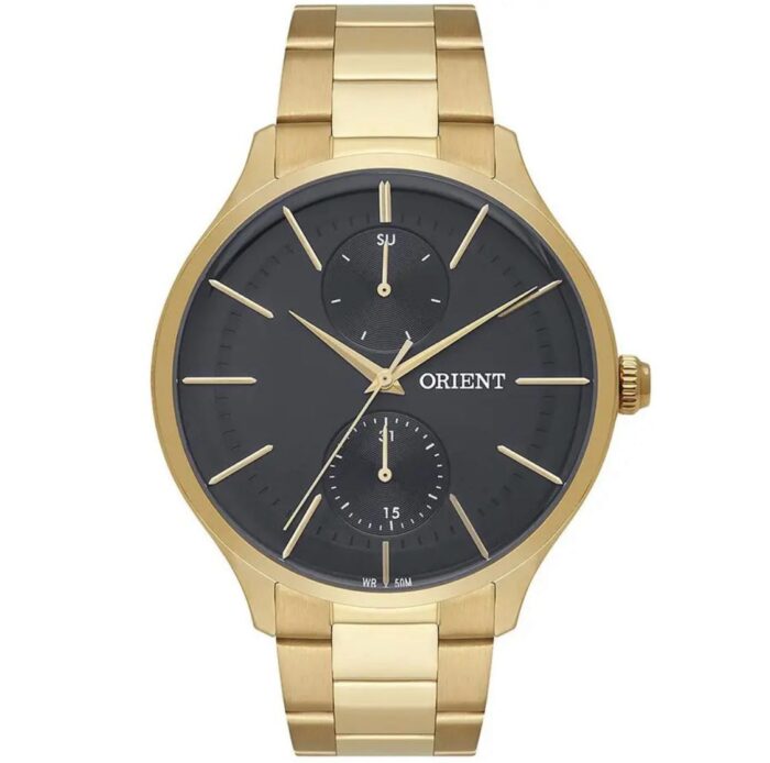 Relógio marca Orient, masculino. Caixa em aço, pulseira dourada, fundo preto.