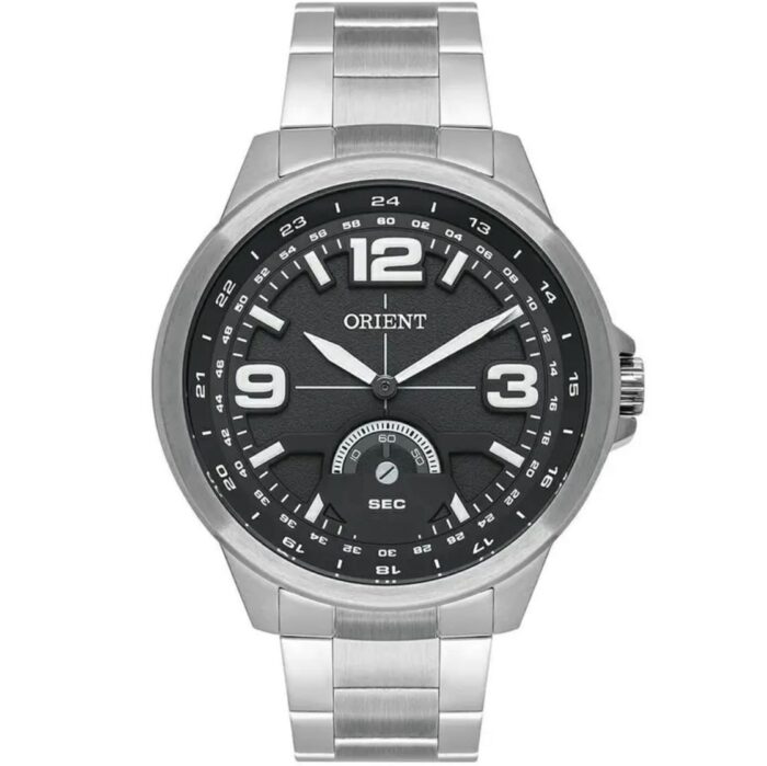Relógio marca Orient, masculino. Caixa em aço, pulseira prateada, fundo preto.