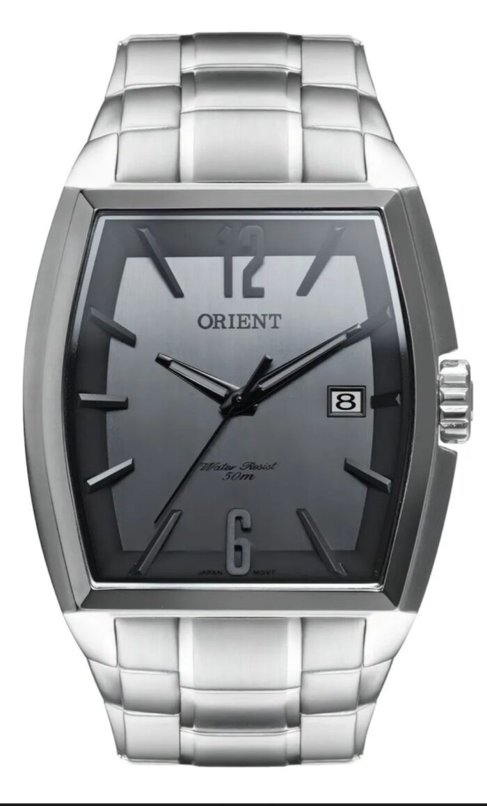 Relógio marca Orient, masculino. Caixa em aço, pulseira prateada e fundo cinza.