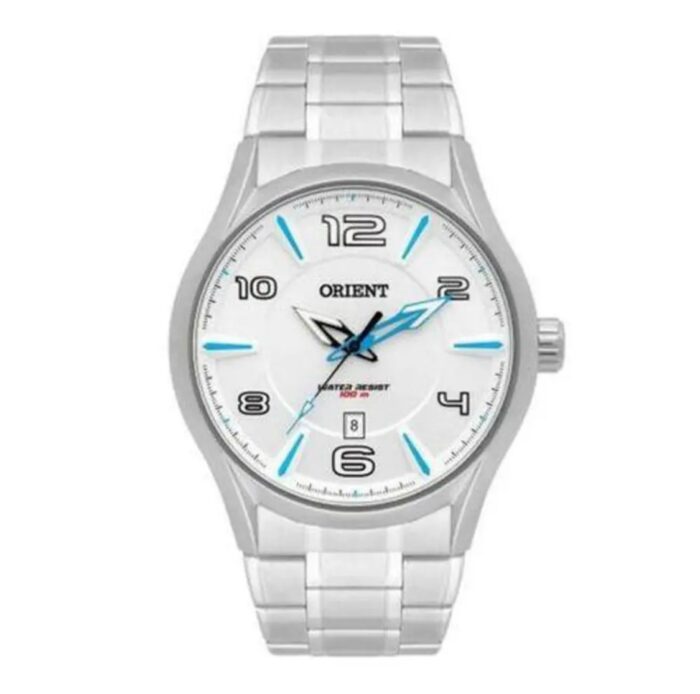 Relógio marca Orient, masculino. Caixa em aço, pulseira em prata e fundo branco com detalhes azuis.