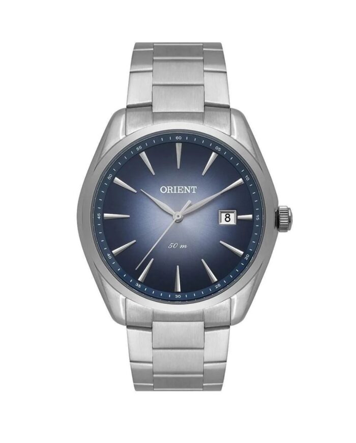 Relógio marca Orient, masculino. Caixa em aço, pulseira em prata e fundo azul.