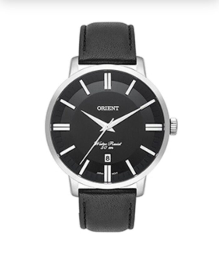 Relógio marca Orient, masculino. Caixa em aço, pulseira em couro preto e fundo preto.