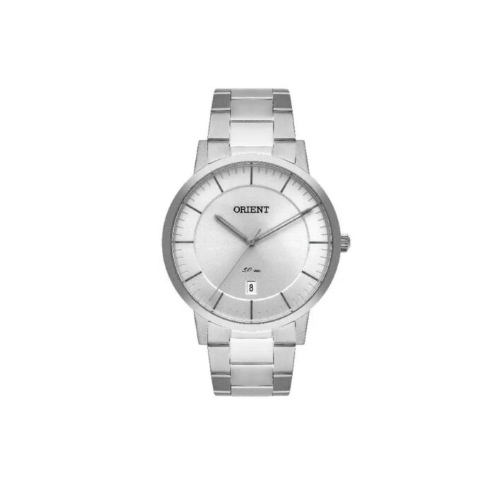 Relógio marca Orient, masculino. Caixa em aço, pulseira prateada.