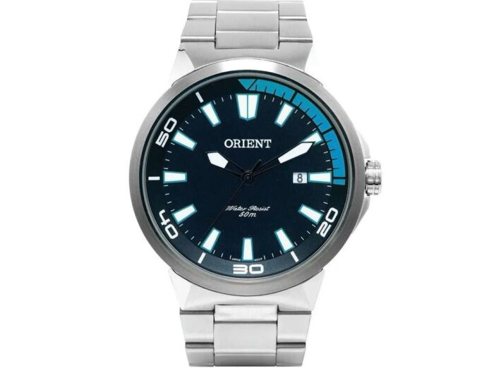 Relógio marca Orient, masculino. Caixa em aço, pulseira em prata e fundo preto com detalhe azul.